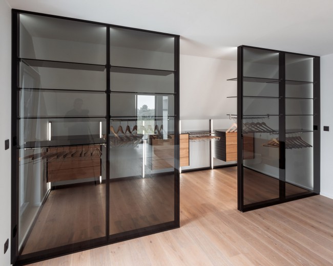 Without the need of any built-in fixtures, the hinge can be placed on top of a finished solid floor and underneath a solid ceiling. Plus, the anodized space frame can be fitted with a plethora of materials, including glass, mirrors, MDF, HPL panels, acrylic stone, and other bespoke designs.